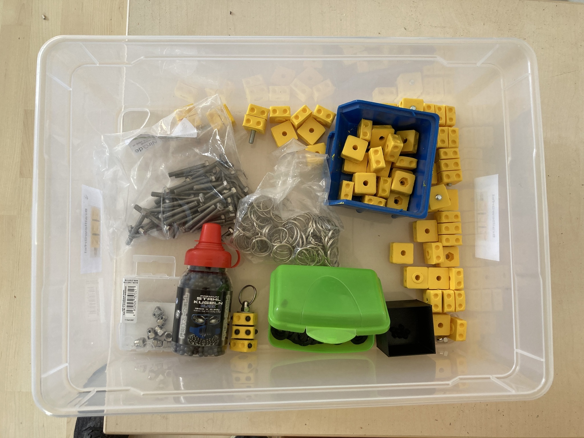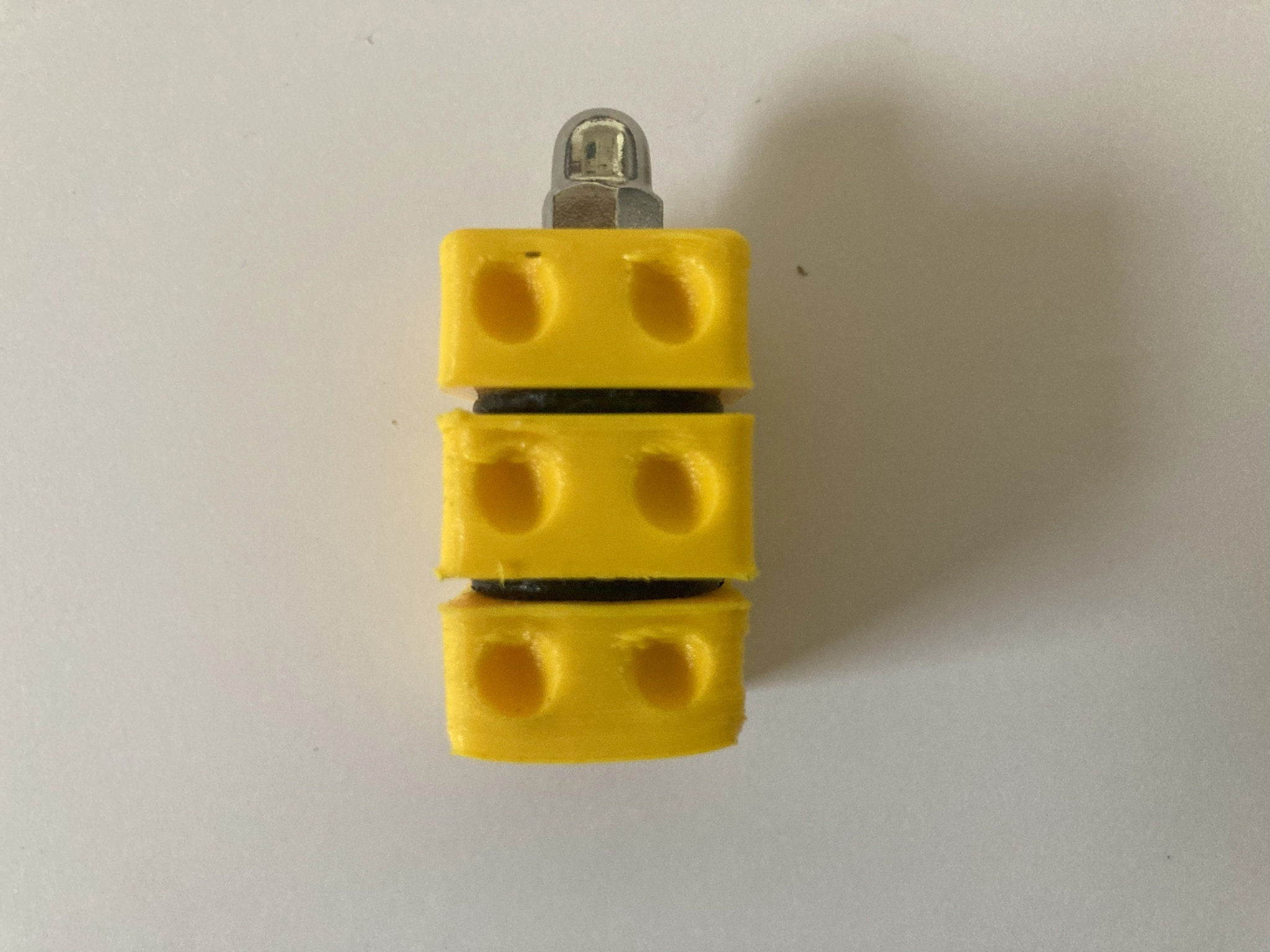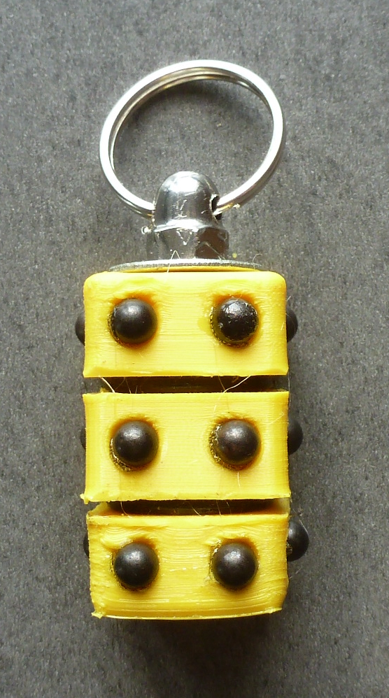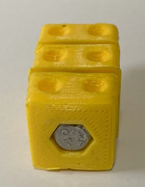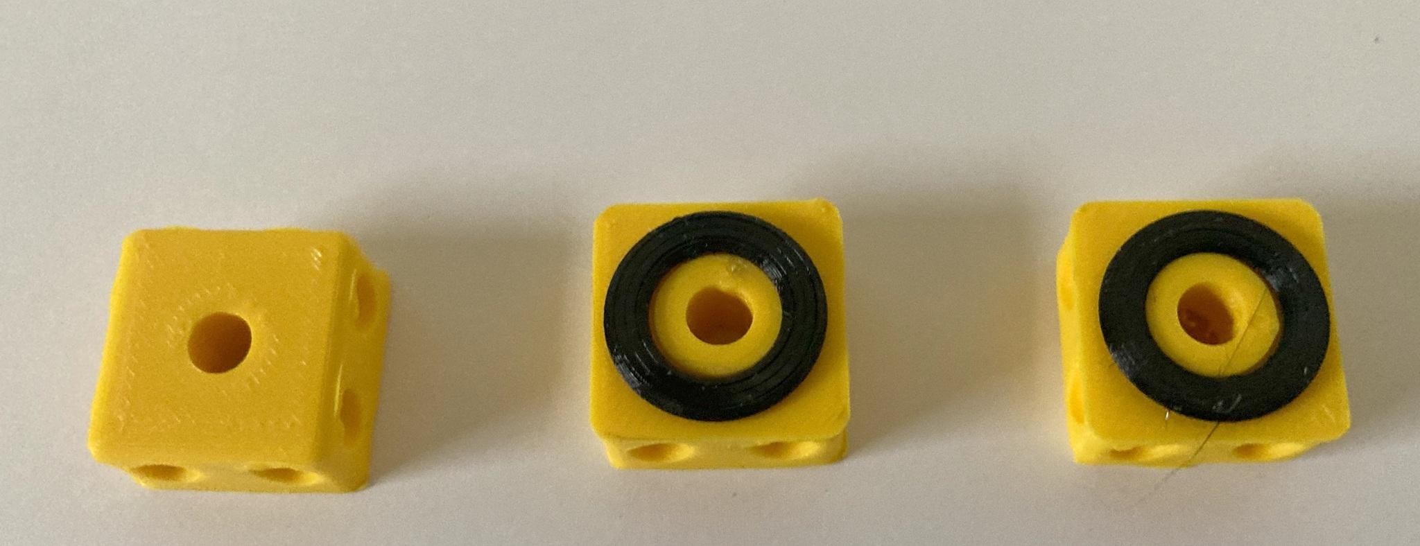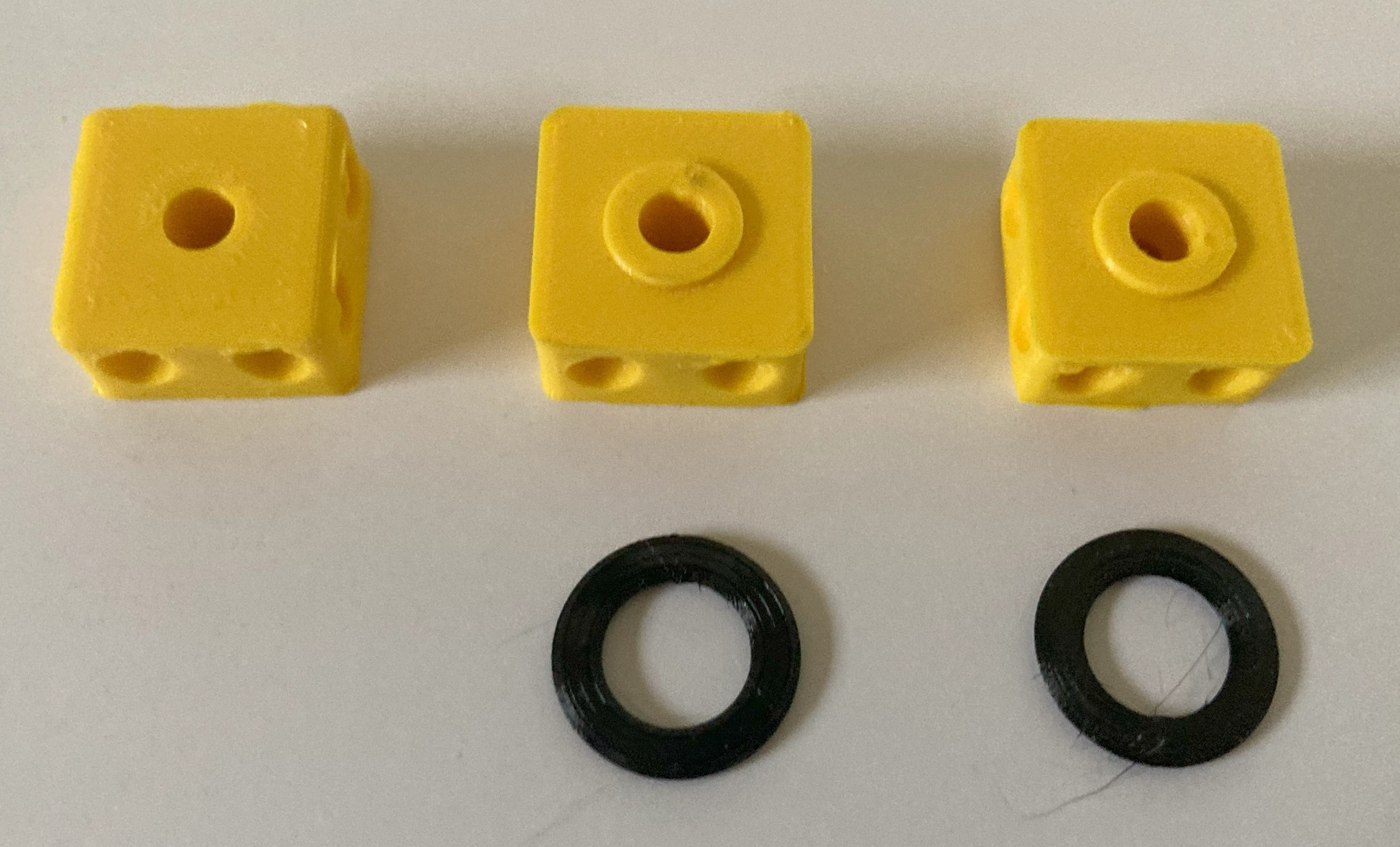 - 3-D gedruckte Teile: die drei gelben Teilwürfel (Oben, Mitte, Unten) und die Abstandsringe (schwarz)