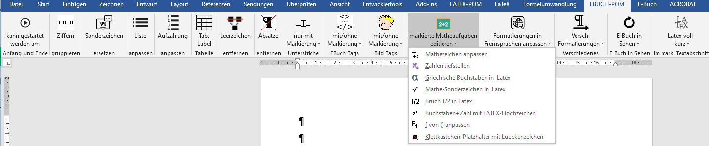 Dann habt ihr in Word folgendes neues Menü: EBUCH-POM mit den entsprechenden Unterpunkten.